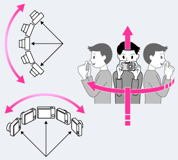 拍攝全景影像的秘訣按照螢幕上指示的方向以穩定的速度呈弧形搖攝相機。靜止的被攝體比移動的被攝體更適合全景攝影。