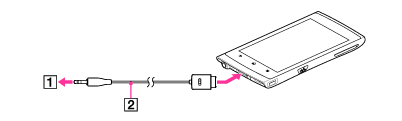 1. 別売の録音用ケーブル(WMC-NWR1)を“ウォークマン”のWM-PORTジャックに接続し、オーディオ機器のヘッドホンジャックに接続する。