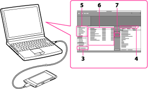 “ウォークマン”をパソコンと接続し、x-アプリで取り込んだコンテンツを“ウォークマン”に転送します。