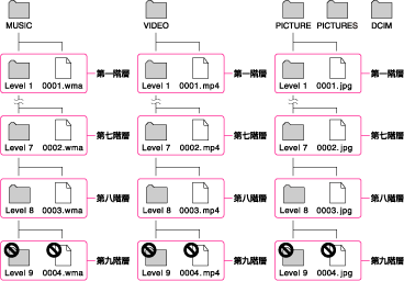 曲・ビデオ・写真は第一から第八階層までのファイルが再生できます。