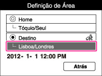 Está a utilizar a câmara definida para a hora do seu destino. Defina a área de destino.