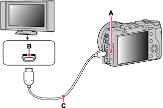 قم بتوصيل موصل HDMI الخاص بالكاميرا (A) ومقبس HDMI الخاص بالتلفزيون (B) باستخدام كابل HDMI (يباع بشكل منفصل) (C).