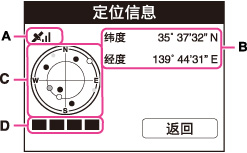 可以在定位信息显示(C)中检查卫星位置。卫星信息获取状态会在三角测量指示器(D)上显示。成功完成三角测量时三角测量指示器将变为绿色。
