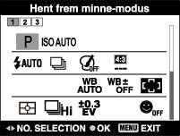 (Hent frem minne-modus) etter fullføring av opptaksinnstillingene, prioriteres de registrerte innstillingene og de originale innstillingene blir ugyldige. Kontroller indikatorene på skjermen før opptak.