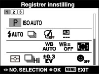 (Hent frem minne-modus) etter fullføring av opptaksinnstillingene, prioriteres de registrerte innstillingene og de originale innstillingene blir ugyldige. Kontroller indikatorene på skjermen før opptak.