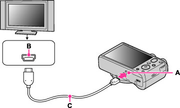 Koble til kameraets HDMI-mikrokontakt (A) og TV-ens HDMI-kontakt (B) med en HDMI-kabel (selges separat) (C).