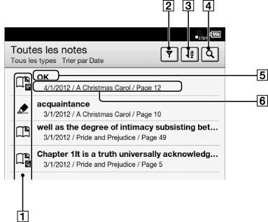 Vous pouvez utiliser [Toutes les notes] pour trouver des annotations parmi tous les livres et périodiques. L’application mémorise toutes les annotations, y compris les signets, les surbrillances et les dessins que vous avez ajoutés sur les pages. Tapez sur un élément de la liste pour sauter jusqu’à la page sur laquelle l’annotation est située.