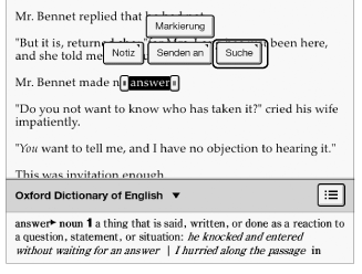 [Wikipedia] oder [Google]. Mit der Anwendung [Browser] wird die Website von Wikipedia oder Google aufgerufen und das Wort gesucht. (Eine Wi-Fi-Netzwerkverbindung ist dazu erforderlich. Einzelheiten dazu finden Sie in Details.) Wenn Sie wieder zum Buch zurückschalten wollen, drücken Sie die Taste