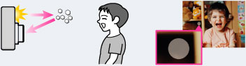 暗い場所、または逆光のとき、自動で発光する。暗い場所では感度を上げて、より遠くまで明るく撮影する。