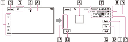 Zum düğmesi (W: Geniş/T: Telefoto), START/STOP düğmesi (film kayıt modunda), PHOTO düğmesi (fotoğraf çekim modunda) (dokunmatik paneli olan modeller)