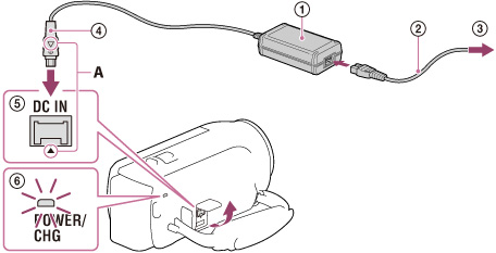 배터리 팩이 만충전되면 POWER/CHG (충전) 램프가 꺼집니다. 캠코더의 DC IN 단자에서 AC 어댑터를 빼십시오.