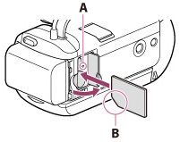 تأكد من اتجاه بطاقة الذاكرة. إذا قمت بإدخال بطاقة الذاكرة بالاتجاه الخاطئ بقوة، قد تتعرض بطاقة الذاكرة أو فتحة بطاقة الذاكرة أو بيانات الصورة للتلف.