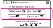 Puede cambiar el modo de grabación para seleccionar la calidad de película al grabar películas con calidad de imagen de alta definición (HD). El tiempo de grabación del soporte de grabación cambia dependiendo del modo de grabación.