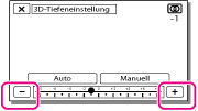 • Da die Parallaxe automatisch angepasst wird, kann es scheinen, als ob 3D-Filme seitlich hin und her wackeln, wenn sie in 2D wiedergegeben werden. Um das Wackeln zu verhindern, passen Sie die Tiefe vor der Aufnahme manuell an.