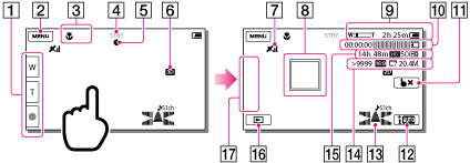 Odhadovaný zostávajúci čas nahrávania, kvalita nahrávania obrazu (HD/STD), frekvencia snímania (50p/50i/25p) a režim nahrávania (PS/FX/FH/HQ/LP)