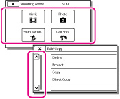 Meny [Camera/Mic] och [Setup] har underkategorier. Välj ikonen för underkategorin så att LCD-skärmen visar listan med menyer i den valda underkategorin.