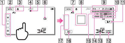 زر الزوم (W: زاوية عريضة/T: صورة مقربة)، زرSTART/STOP (في وضع تسجيل صور متحركة)، زرPHOTO (في وضع تسجيل صور ثابتة)