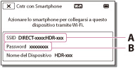 Sullo smartphone, selezionare l’SSID visualizzato sullo schermo LCD della videocamera, quindi immettere la password visualizzata sullo schermo LCD della videocamera.