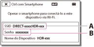 No smartphone, selecione o SSID exibido na tela LCD da câmera de vídeo e insira a senha exibida na tela LCD da câmera de vídeo.