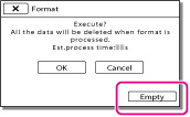 Jos lopetat [Empty]-toiminnon, kun [Executing...] on näkyvissä, muista päättää toiminto suorittamalla [Format] tai [Empty], kun seuraavan kerran käytät videokameraa.