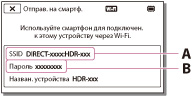 На смартфоне выберите имя сети, отображаемое на экране LCD видеокамеры, а затем введите пароль, также отображаемый на экране LCD камеры.