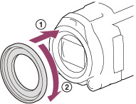 若要取下镜头罩,请按与箭头所示相反的方向转动镜头罩的紧固环。