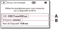 Sur votre smartphone, sélectionnez le SSID affiché sur l'écran LCD du caméscope, puis entrez le mot de passe affiché sur l'écran LCD du caméscope.