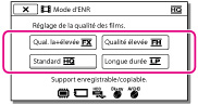 Vous pouvez changer le mode d'enregistrement afin de sélectionner la qualité du film pendant que vous enregistrez un film en mode de qualité d'image haute définition (HD). La durée d'enregistrement ou le type de support sur lequel il est possible de copier les images peuvent changer en fonction du mode d'enregistrement sélectionné. ([Standard