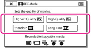 Du kan växla inspelningsläge för att välja filmkvalitet när du spelar in filmer i HD-bildkvalitet (högupplöst). Inspelningstiden eller typen av mediaenhet som bilderna kan kopieras till kan ändras, beroende på valt inspelningsläge. ([Standard