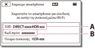 Στο έξυπνο κινητό τηλέφωνο, επιλέξτε το SSID που εμφανίζεται στην οθόνη LCD της βιντεοκάμερας και στη συνέχεια εισάγετε τον κωδικό πρόσβασης που εμφανίζεται στην οθόνη LCD της βιντεοκάμερας.