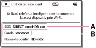 De pe smartphone, selectaţi SSID afişat pe ecranul LCD al camerei video şi apoi introduceţi parola afişată pe ecranul LCD al camerei video.