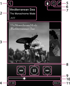 タップすると、再生中の曲の冒頭、あるいは前の曲/次の曲に移動します。