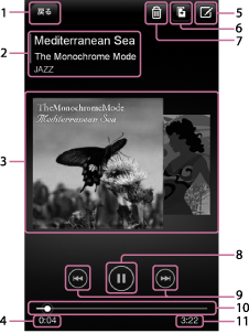 タップすると、再生中の曲の冒頭、あるいは前の曲/次の曲に移動します。