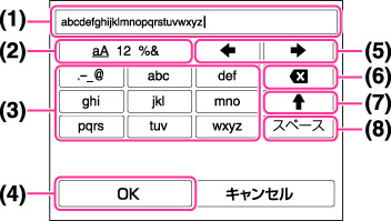 を1回押して「a」を表示 カーソル移動(5)の「 」を選び、中央の を押す 「abc」のキーを選び、中央の を2回押して「b」を表示 「def」のキーを選び、中央の を1回押して「d」を表示 |