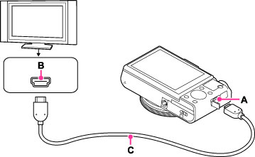 本機のHDMI端子(A)とテレビのHDMI端子(B)をHDMIケーブル(別売)(C)で接続する