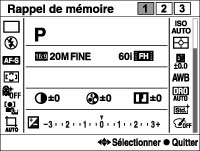 (Rappel de mémoire) après avoir terminé les réglages de prise de vue, les réglages enregistrés ont la priorité et il se peut que les réglages initiaux deviennent invalides. Vérifiez les indicateurs sur l’écran avant la prise de vue.