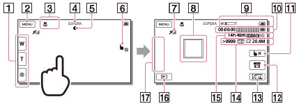 Botão de zoom (W: Grande Angular/T: Telefoto), botão START/STOP (no modo de gravação de filme), botão PHOTO (no modo de gravação de foto)