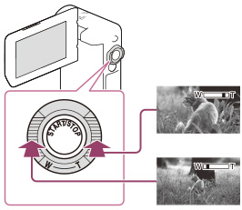 Mova a alavanca de zoom motorizado (W ou T) para ampliar ou reduzir o tamanho da imagem.