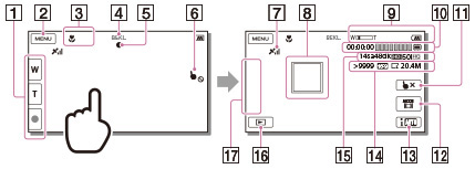 Zoom düğmesi (W: Geniş/T: Telefoto), START/STOP düğmesi (film kayıt modunda), PHOTO düğmesi (fotoğraf çekim modunda)