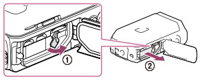 Luk LCD-skærmen, skub på låseknappen til dækslet for at føre dækslet til batteriet/hukommelseskortet/stikket tilbage, og åbn derefter dækslet til batteriet/hukommelseskortet/stikket.