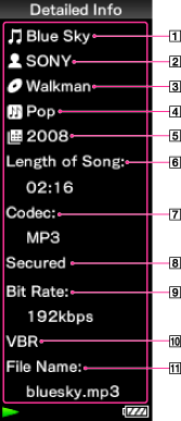 Afişează informaţii detaliate despre o piesă muzicală, precum timpul de redare, formatul audio, debitul binar şi numele fişierului [Detalii].