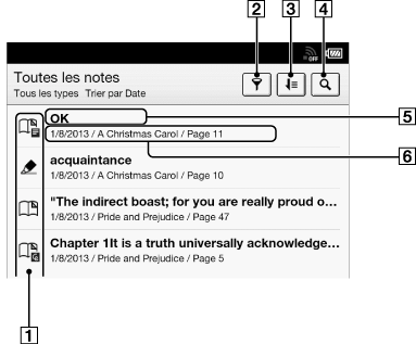 Vous pouvez utiliser [Toutes les notes] pour trouver des annotations parmi tous les livres et périodiques. L’application mémorise toutes les annotations, y compris les signets, les surbrillances et les dessins que vous avez ajoutés sur les pages. Tapez sur un élément de la liste pour sauter jusqu’à la page sur laquelle l’annotation est située.