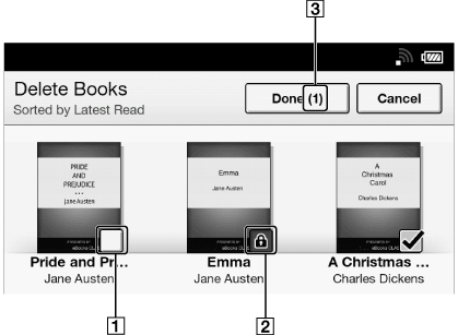 Du kan slette flere elementer på én gang. Dette er praktisk for å frigjøre plass på din Reader.