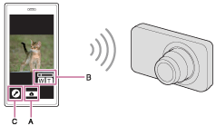 - [フラッシュ]、[セルフタイマー]やスマートフォンへの画像保存の設定ができます(C)。