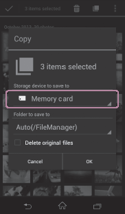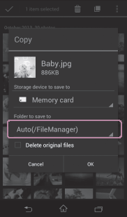 (Yeni klasör) öğesine dokunup bir klasör adı girin ve [Tamam(OK)] öğesine dokunun.Kopyalama işlemi tamamlandığında kopyalama kaynağı dosyasını silmek isterseniz, [Orijinal dosyaları sil(Delete original files)] seçeneğini belirleyin. (Android cihazınıza ekli bir harici depoda kayıtlı olması durumunda kopyalama kaynağını silemeyebileceğinizi unutmayın.)