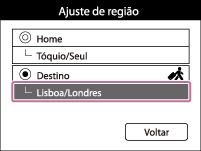 (Configurações de Relógio) - [Ajuste de região] - modo desejado - [OK] -