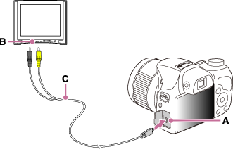 2. Tilslut USB / A/V OUT-stikket (A) og TV'ets lyd/video-indgangsstik (B) ved hjælp af det dedikerede A/V-kabel VMC-15CSR1 (sælges separat) (C).
