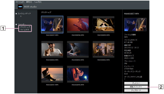 [デスクトップ]、[マイビデオ](Macの場合は[ムービー])、または更にその中のフォルダー()をクリックする。