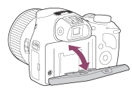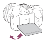 - モニターの角度は、下向きに60度、上向きに90度動かせます。高い位置や低い位置に構えて撮影するときに便利です。可動範囲を超えて無理にモニターを動かすと故障の原因になります。