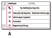 Os menus [Câmara/Microfone] e [Definição] têm subcategorias. Selecione o ícone da subcategoria para poder selecionar a opção de menu pretendida.